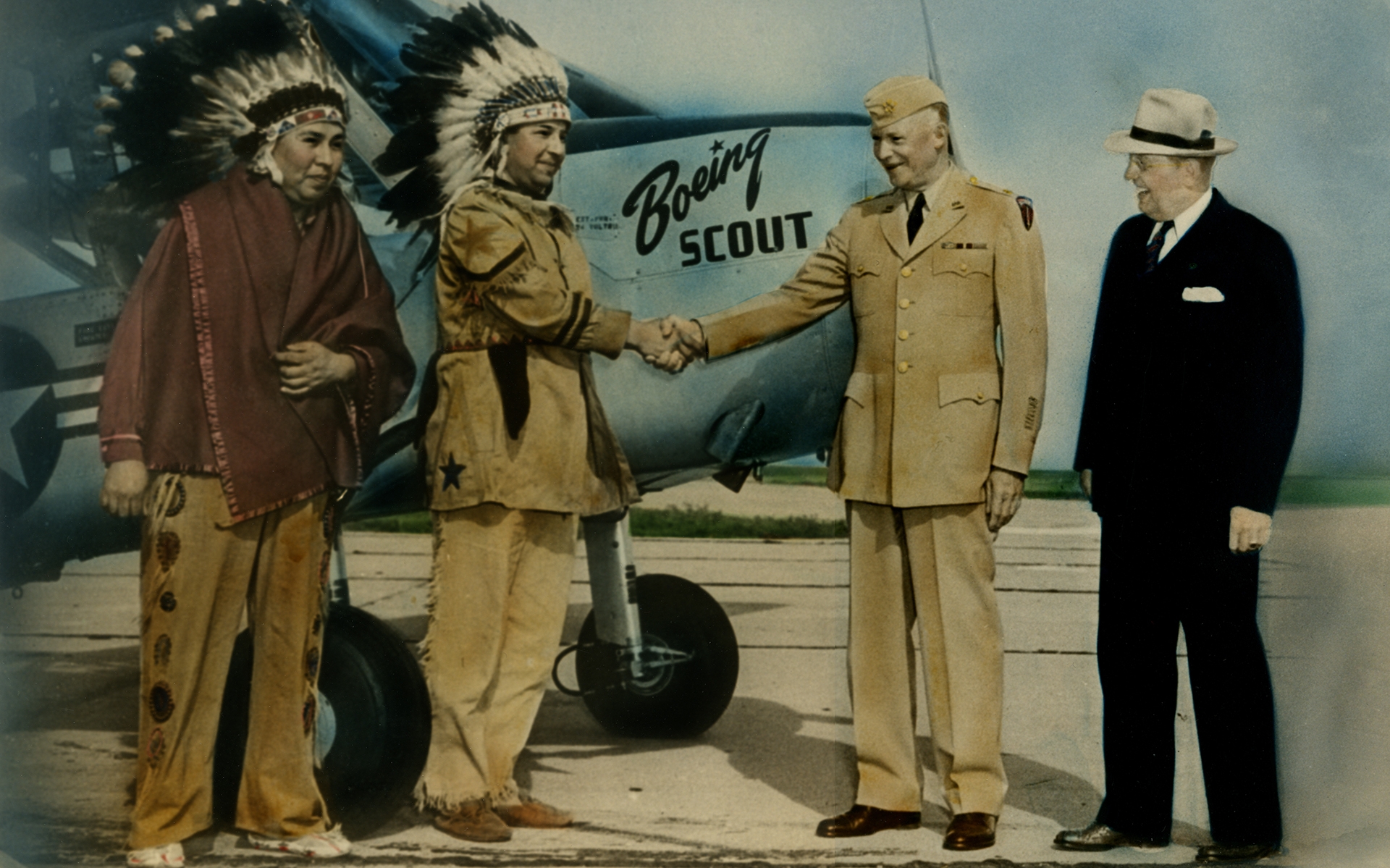 The experiment in tribal self-government had barely begun when the tremors of World War II rocked the land and the people.  Pearl Harbor sparked the ancestral warrior spirit, calling forth a flurry of Indian volunteers. Eventually some 44,000 served.